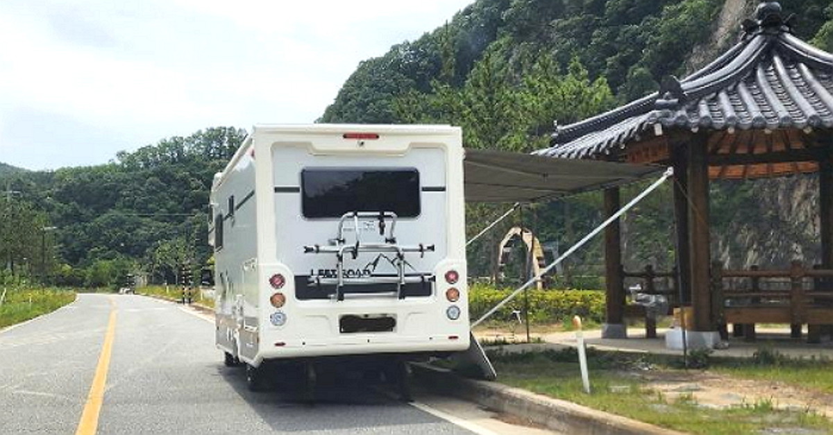 뿐만 아니라 캠핑카 주인은 어닝(그늘막)을 펴 정자에 연결한 상태였다.