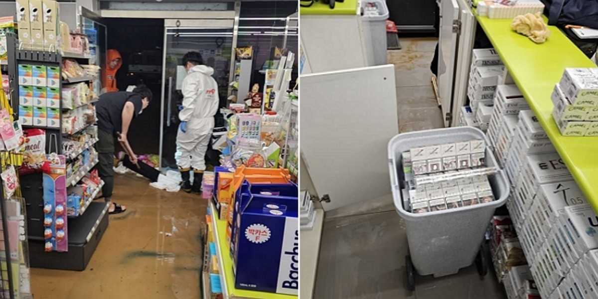 [인사이트] 정봉준 기자 = 폭우로 인해 물이 차오른 편의점. 사장님은 좌절에 빠질 뻔했지만 '초엘리트' 알바생이 이를 구해줘 이목을 끌고 있다.