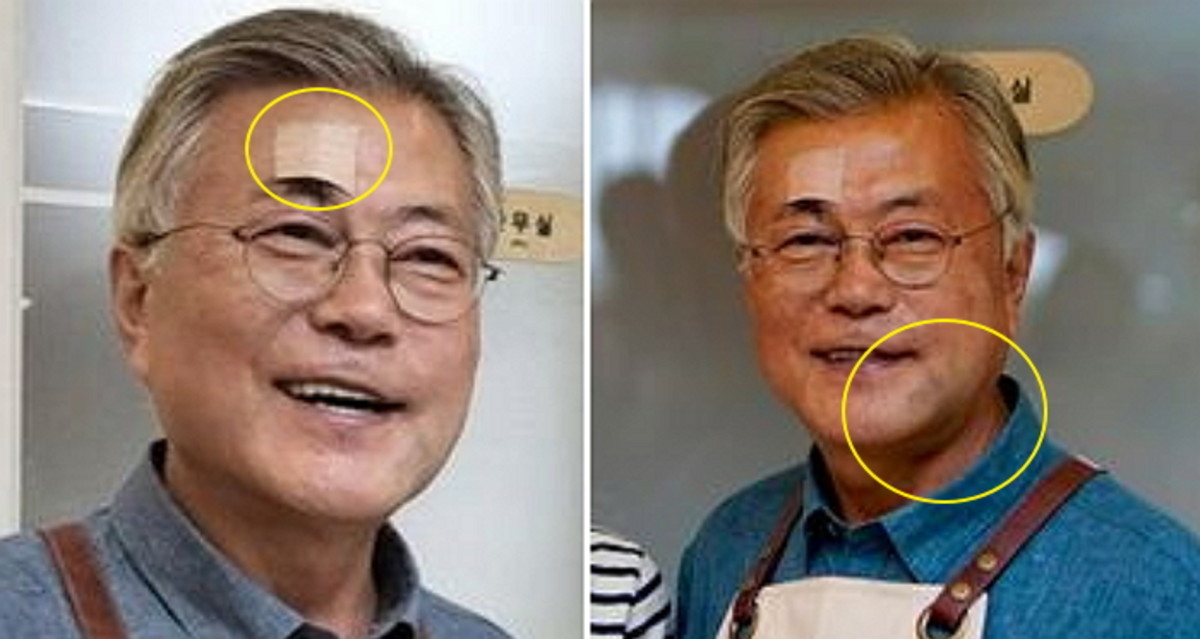 그런데 문 전 대통령의 오른쪽 턱 주변에는 멍이 든 듯 푸르스름한 자국이 나 있다. 게다가 눈썹 위에는 반창고가 붙어 있다.