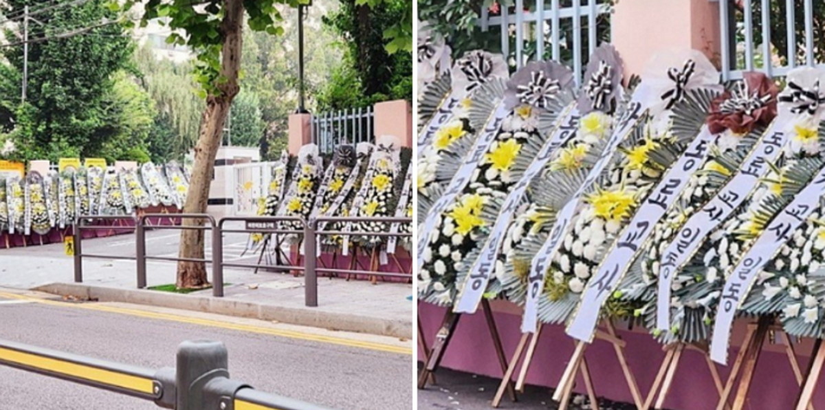 [인사이트] 강지원 기자 = 서초구 한 초등학교 내에서 극단 선택으로 사망한 교사를 추모하는 화환이 학교 앞을 가득 채웠다.