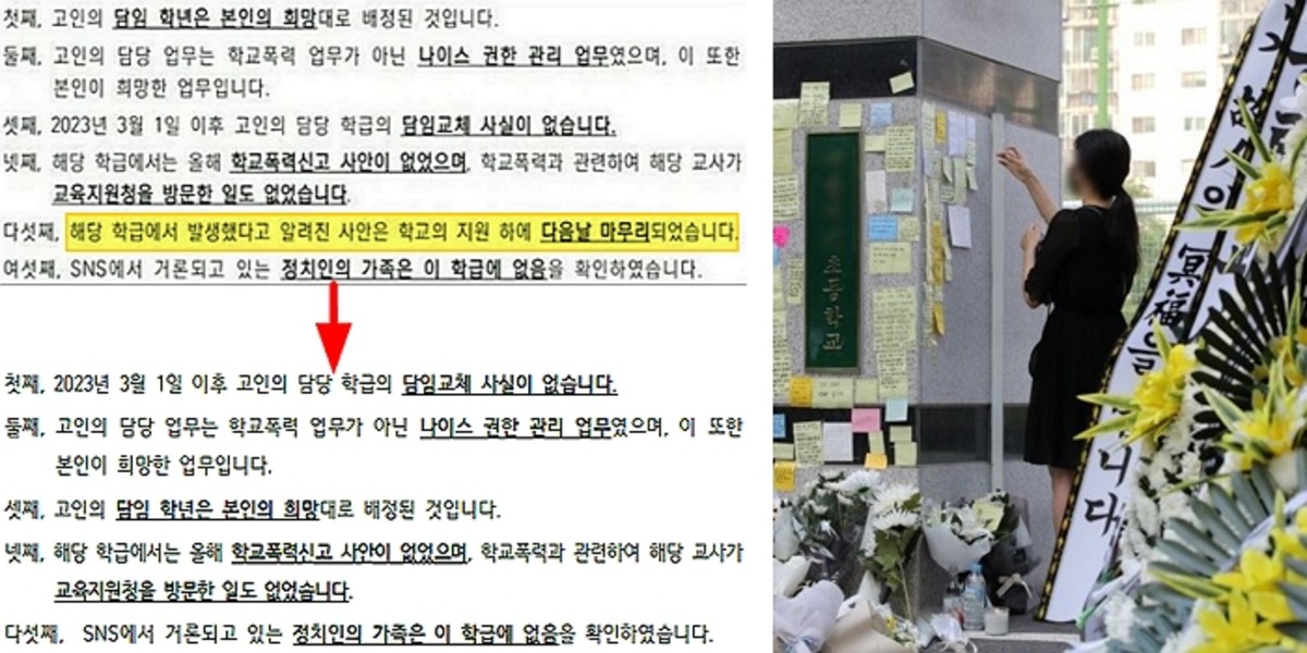 이어 "2023년 3월 1일 이후 고인의 담당 학급의 담임교체 사실이 없다. 고인의 담당 업무는 학교폭력 업무가 아닌 나이스 권한 관리 업무였으며, 이 또한 본인이 희망한 업무"라며 "고인의 담임 학년은 본인의 희망 대로 배정된 것"이라고 밝혔다.