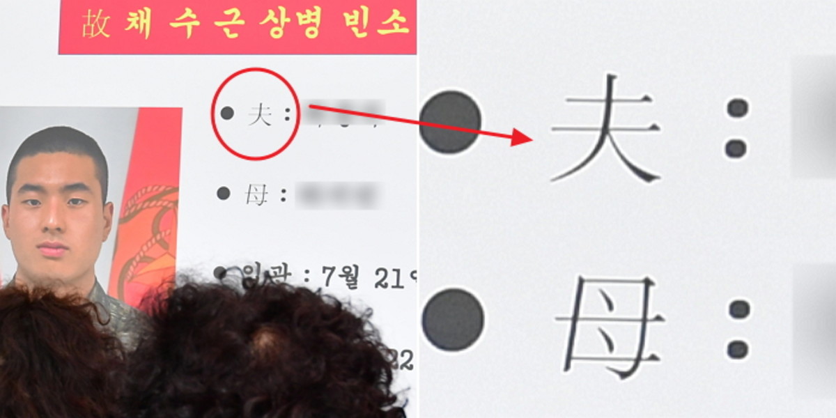 얼핏 보면 아무 문제 없을 수도 있지만 자세히 보면 이야기가 달라진다. 채 상병의 아버지를 뜻하는 한자가 아비 부(父)가 아닌 지아비 부(夫)로 적혀 있기 때문이다.