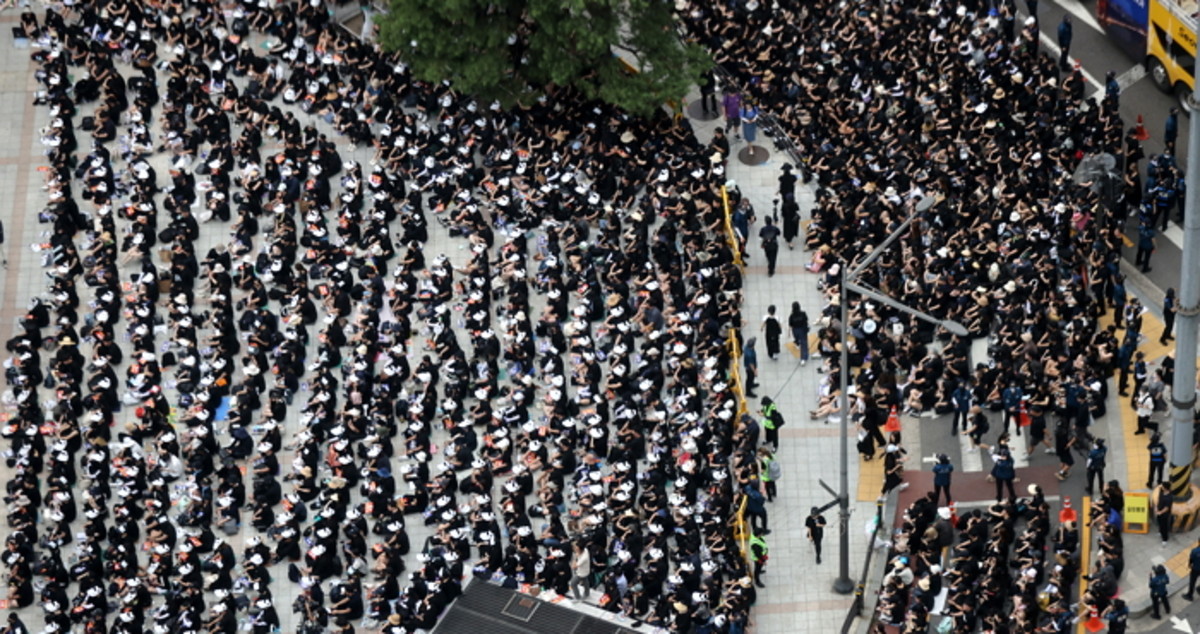 전국교사모임 주최로 열린 집회에서 참가자들은 애도의 뜻으로 검은색 의상과 검은색 마스크를 착용했다.