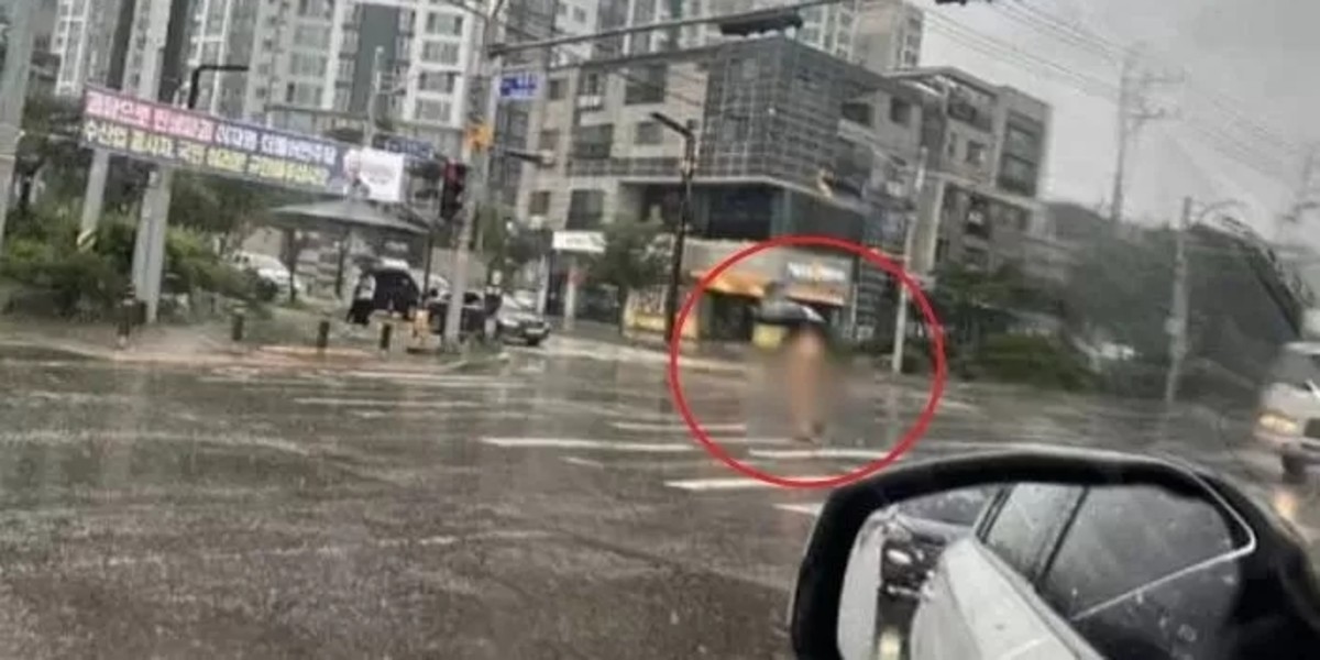 [인사이트] 강지원 기자 = 비가 쏟아지던 날 한 남성이 실오라기 하나 걸치지 않은 나체 상태로 횡단보도를 건너는 사진이 올라와 화제다.