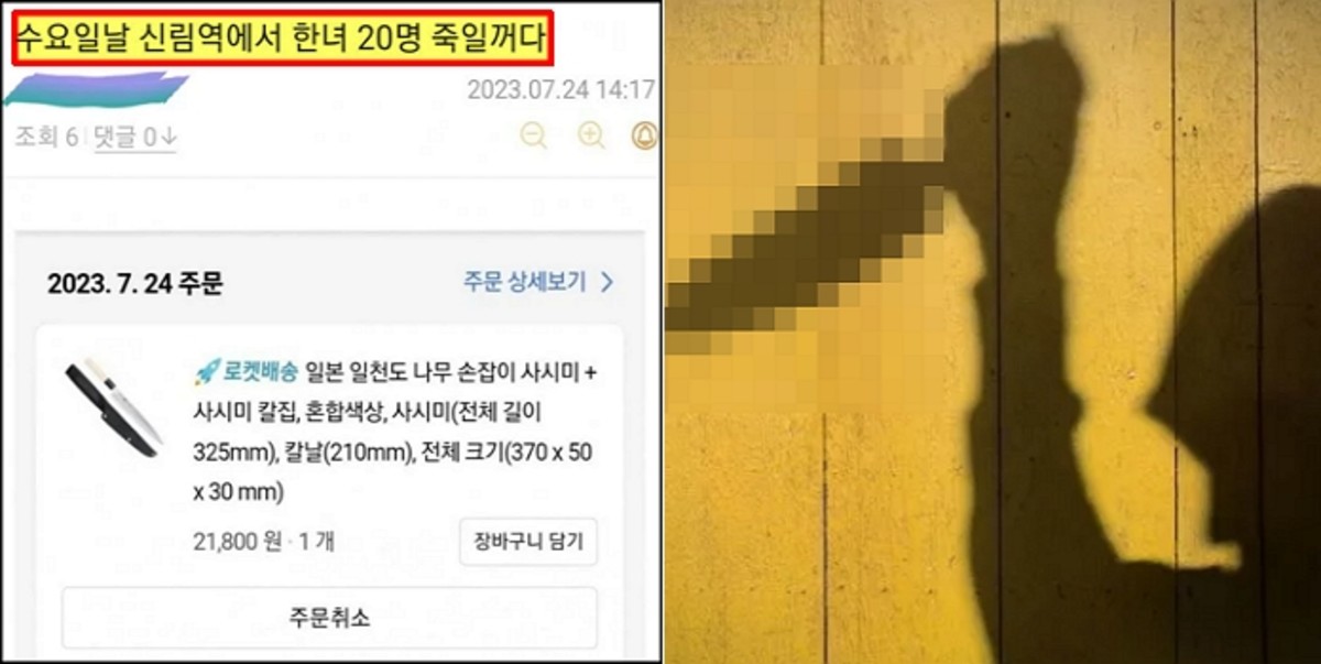 글쓴이는 칼날이 굉장히 날카롭기로 유명한 사시미칼을 구매한 내역까지 보여주며 공포심을 조성했다.