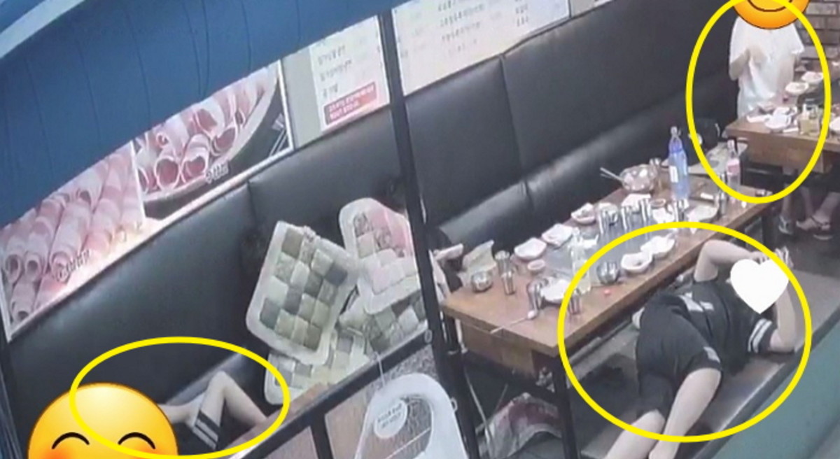 사진에는 술잔이 가득 쌓인 식당 식탁 옆에 드러누운 아이들 모습이 담겼다.