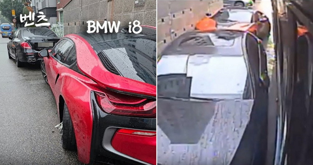 버스가 우측에 주차된 BMW i8과 벤츠를 지나던 그때, 충돌이 일어나고 말았다.