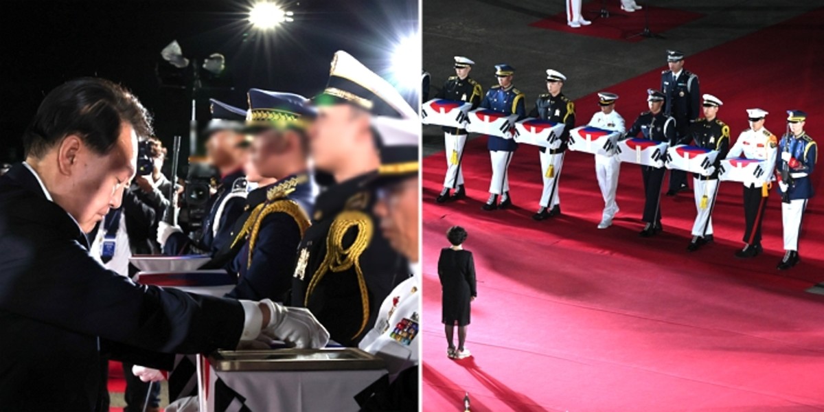 특별수송기가 한국방공식별구역(KADIZ)에 진입하자 F35A 전투기 편대가 호위했고, 윤 대통령과 유가족 등 참석자들은 특별수송기 앞에 도열해 유해를 맞았다.