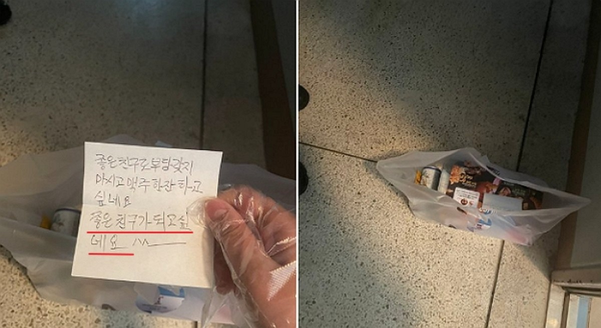 문 앞에는 A씨가 놓고 간 닭꼬치 6개와 '좋은 친구가 되고 싶네요. 맥주 한잔합시다'라고 적힌 메모가 놓여있었다.