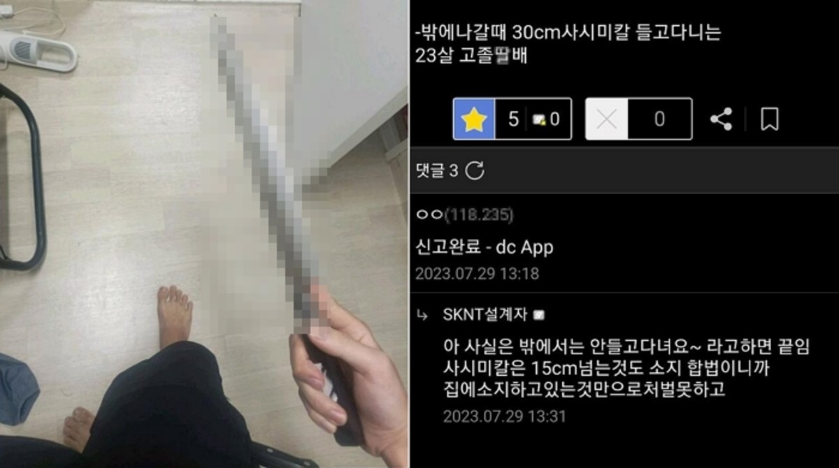 그는 가끔 의미를 알 수 없는 말을 횡설수설 남기기도 했으며, 지난 7월 29일에는 사시미 칼 사진을 올리며 "밖에 나갈 때 사시미칼 들고다니는 23살 고졸 X배"라며 자신을 소개하기도 했다.