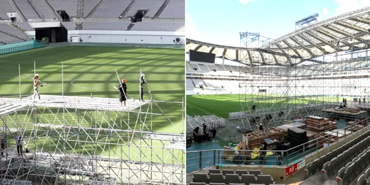 사진에 따르면 그라운드 위 잔디에 무대가 설치되고 있다. 잔디 보호를 명목으로 깔판을 깔고 무대를 설치했지만, 시설물 무게 대비 한없이 얇은 깔판은 소용이 없어 보인다.