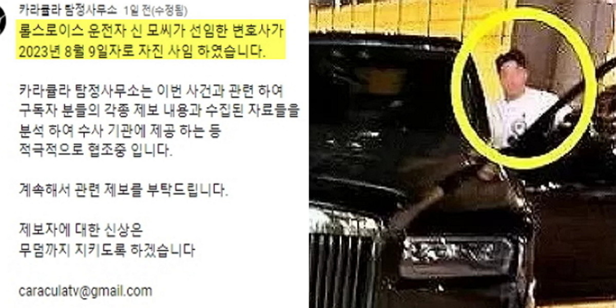 카라큘라는 "롤스로이스 운전자 신씨가 선임한 변호사가 2023년 8월 9일자로 자진 사임했다"라고 말했다.