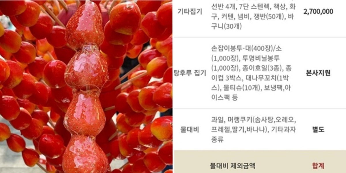 교육비는 3,000,000원, 홍보물 및 비품 사용은 400,000원으로 책정됐다. 탕후루 집기는 본사에서 지원된다.