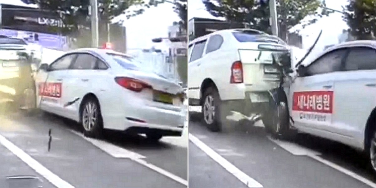 공개된 영상 속에는 신호 대기하며 정차 중인 코란도를 뒤에서 그대로 박아버리는 흰색 택시의 모습이 담겼다.