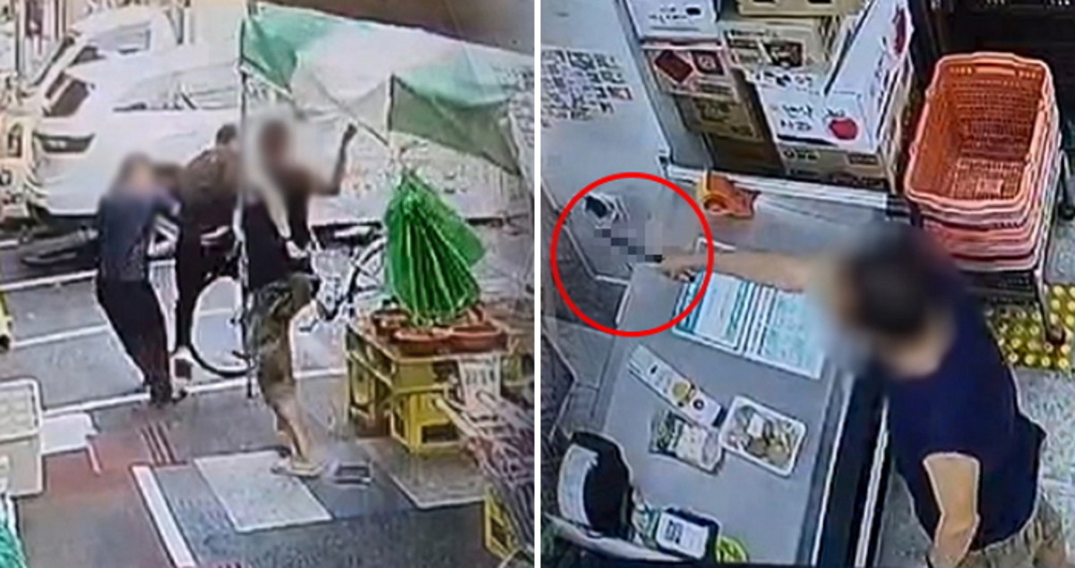 공개된 영상에는 A씨가 야외 매대를 정리하는 직원에게 다가가 삿대질하고 실랑이를 벌이다 뒷주머니에서 흉기를 꺼내 위협하는 모습이 담겼다.