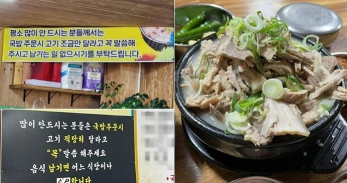 돼지국밥을 주문하려던 손님 A씨는 국밥집 한쪽 안내판에 "평소 많이 안 드시는 분들께서는 국밥 주문시 고기 조금만 달라고 꼭 말씀해 주시고 남기는 일 없으시길 부탁드립니다"란 문구가 써 있는 걸 봤다.