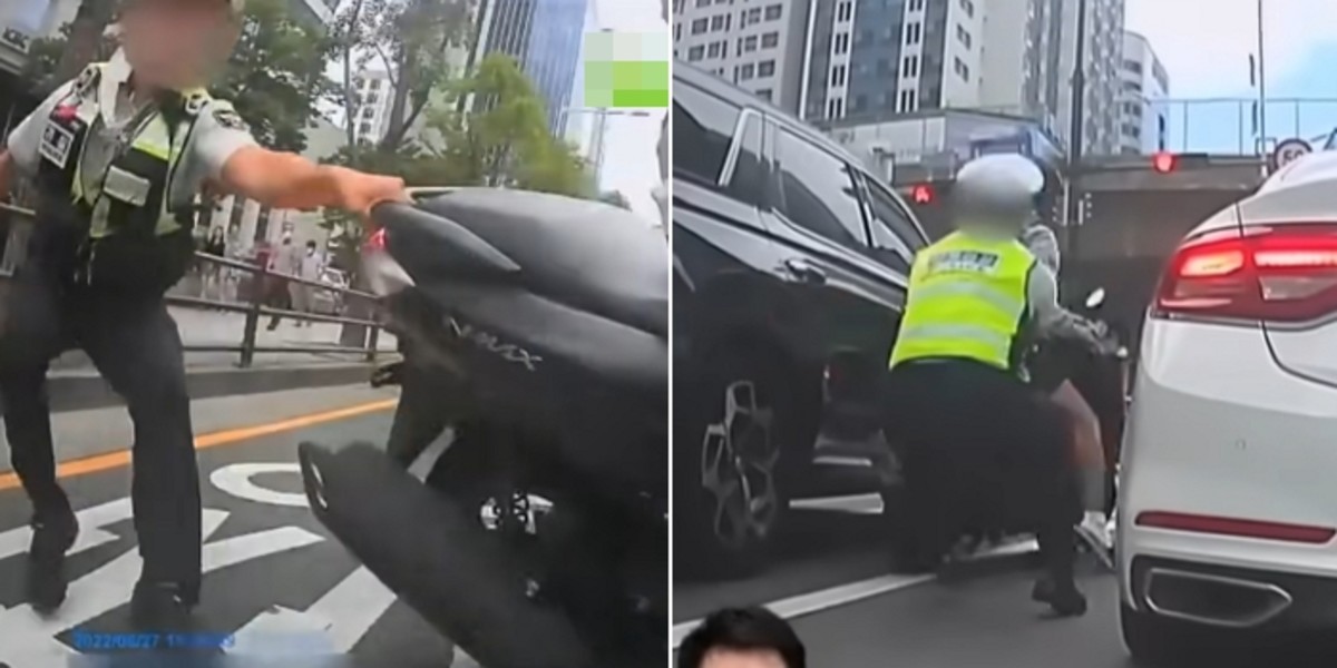 영상에서 A씨는 무등록 오토바이를 타고 신호대기 중이었다. 이때 교통 경찰관이 다가와 단속하려 하자 A씨는 그대로 달아나려 했다.