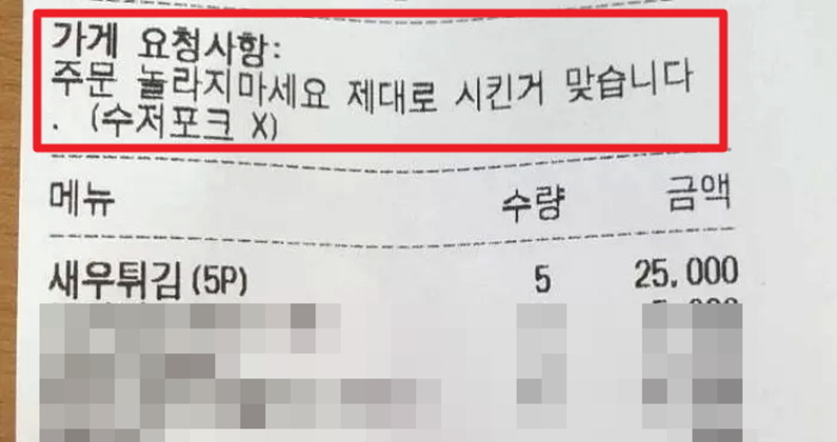 영수증 속 가게 요청사항에는 "주문 놀라지 마세요. 제대로 시킨 거 맞습니다"라는 짧은 글이 적혀져 있었다.