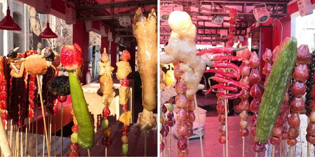 일반적인 산사와 딸기로 만든 탕후루뿐만 아니라 고추, 대파, 생강 탕후루가 진열돼 있었기 때문이다.