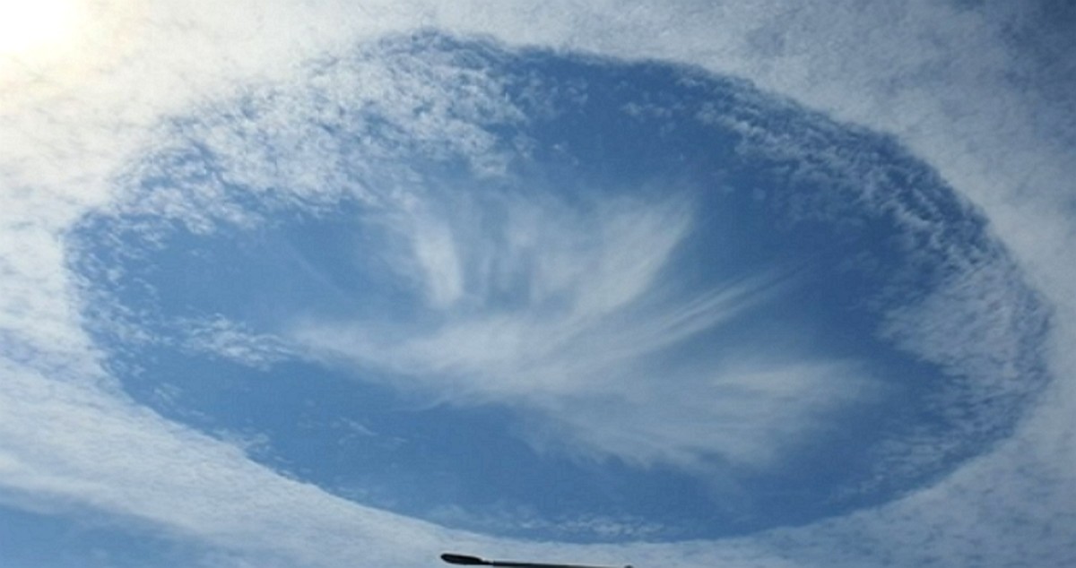 '폴스트리크 구름'이라고 불리는 이 현상은 구름층 사이에 형성된 얼음조각이 외부 자극으로 인해 하강하면서 주변의 수증기를 흡수해 구멍이 뚫린 것처럼 보이는 현상이다.