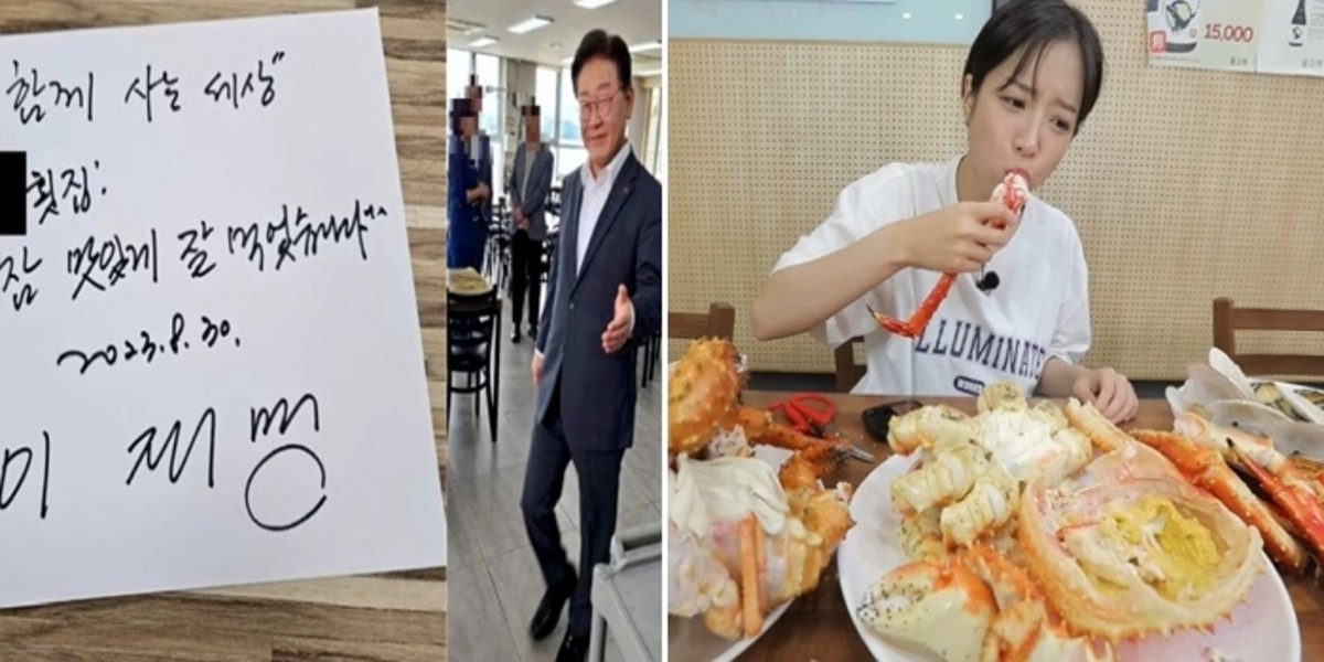 이 대표는 식사를 마친 뒤 남긴 방명록에 "함께 사는 세상. OO횟집, 참 맛있게 잘 먹었습니다"라는 글귀를 남겼다.