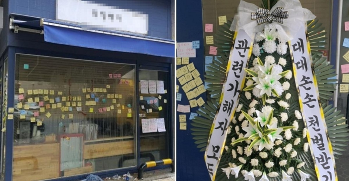 이미 문을 닫은 이곳의 외벽에는 '살인자', '가해자', '자식 교육 똑바로 시켜라', '인간 쓰레기'와 같은 문구가 써진 포스트잇이 가득 붙어 있다.
