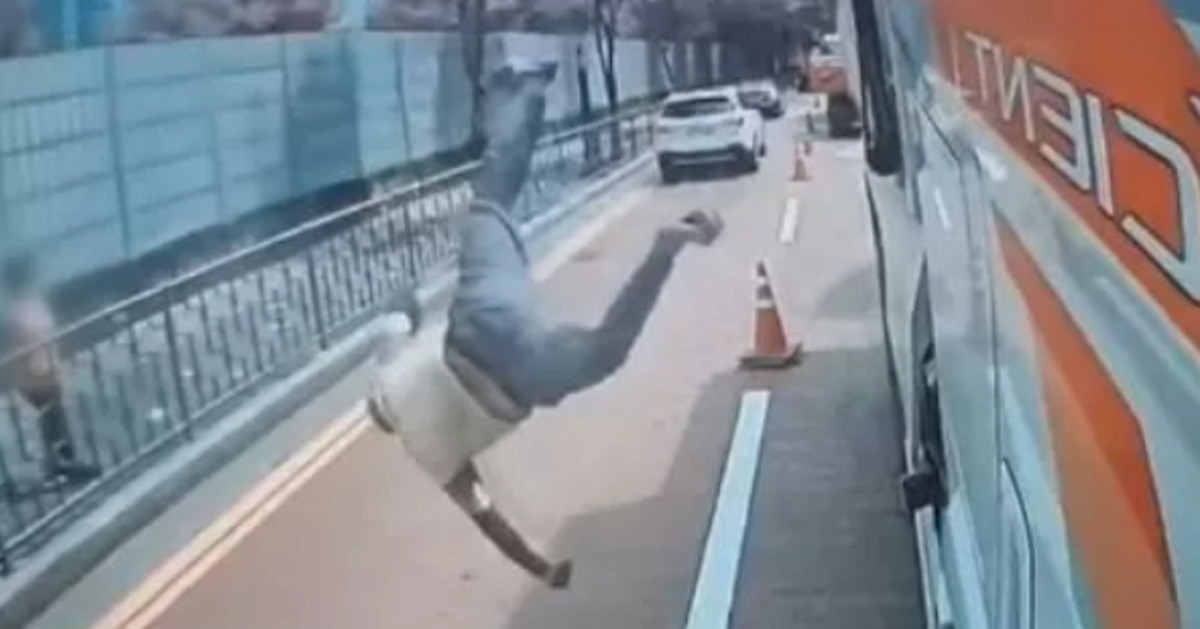 영상에는 A씨가 덤프트럭 위를 올라갔다 내려갔다를 반복하다 그만 중심을 잃고 추락하는 과정이 담겼다. 이어 바닥에 쓰러진 A씨를 향해 한 차량이 다가오는 모습이다.