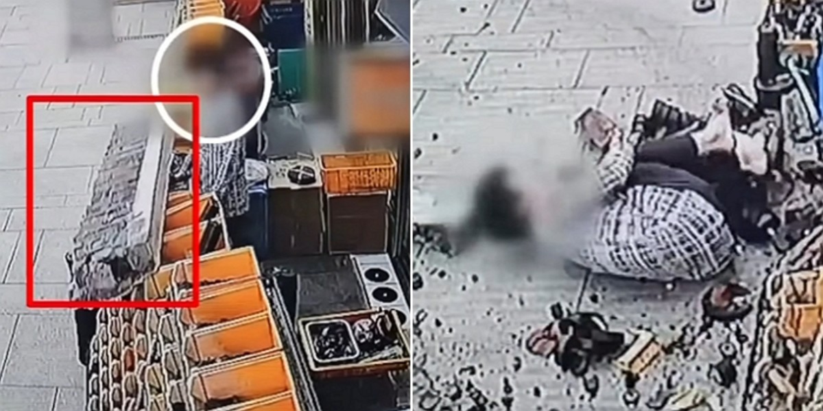 공개된 영상을 보면 사건은 순식간에 발생했다. 외벽이 떨어지자, 가게 주인인 60대 A씨는 발을 움켜잡으며 고통스러워했다.