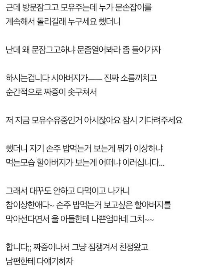 화가 나서 대꾸도 없이 다먹이고 나가니까 시아버지는 한술 더 떠서 "참 이상한 애다. 손주 밥 먹이는 것 보고 싶은 할아버지를 막아선다"고 했다.