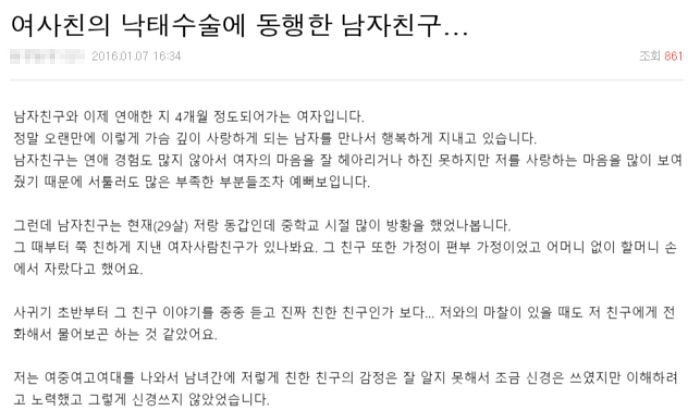 중학교 여자사람친구(여사친)의 낙태수술에 따라간 남자친구에 대한 사연이 공개돼 이를 두고 누리꾼들 간의 의견이 분분하다.
