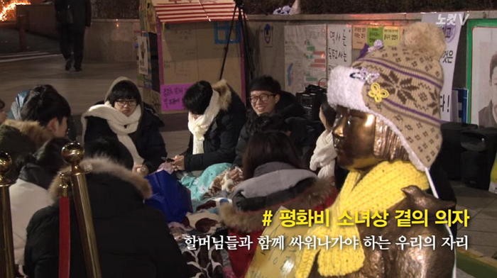 소녀상을 지키기 위해 거리 농성에 나선 서울대학교 겨레하나 소속 대학생이 평화비 소녀상에 담겨있는 의미들을 소개했다.