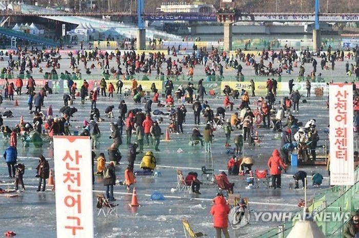 사진 속 산천어 축제에 참가한 많은 관광객들이 얼음 벌판을 가득 메우고 있는 모습은 놀라움을 자아낸다.