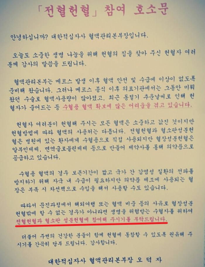 호소문에 따르면 현재 병원에서는 메르스 종식 이후 그동안 미뤄온 수술을 하기 시작하면서 혈액사용량이 많아졌고, 최근 추운 날씨로 인해 헌혈자가 줄어든 상태다.