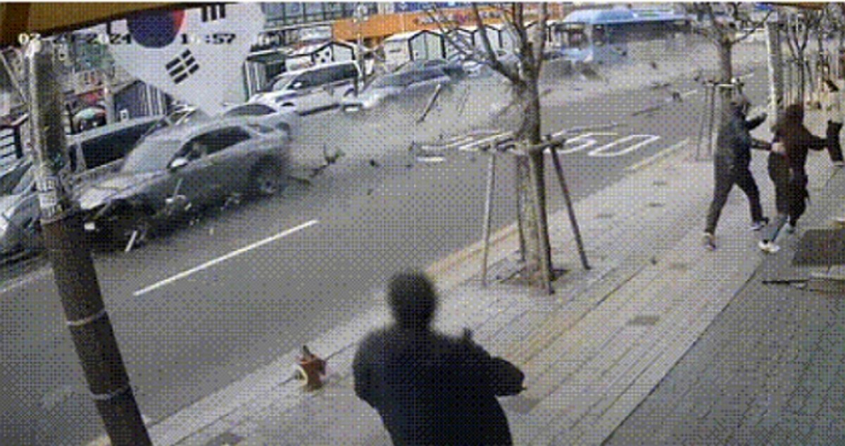 갑작스러운 굉음과 튀는 파편에 길을 걷던 시민들은 깜짝 놀라 동분서주하고 있다. 횡단보도까지 질주한 가해 차량은 건너던 보행자를 들이받은 후 앞 선 차들과 충돌한 뒤에야 멈춰 섰다.