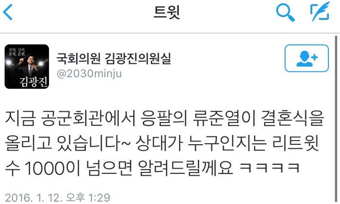 이어 "상대가 누군지는 리트윗 수 1000이 넘으면 알려드릴게요~"라고 말해 보는 이들을 어처구니없게 했다.