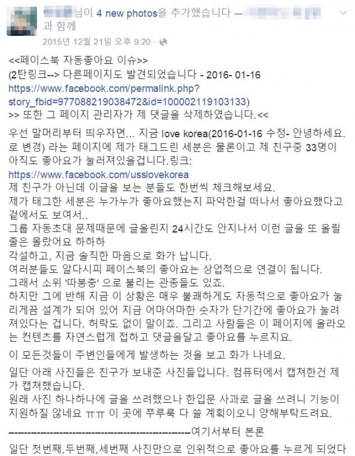 누리꾼 이모씨는 자신의 페이스북을 통해 "매우 불쾌하게도 자동적으로 좋아요가 눌리게끔 설계가 되어 있어 지금 어마어마한 숫자가 단기간에 좋아요가 눌려져 있다"고 주장했다.