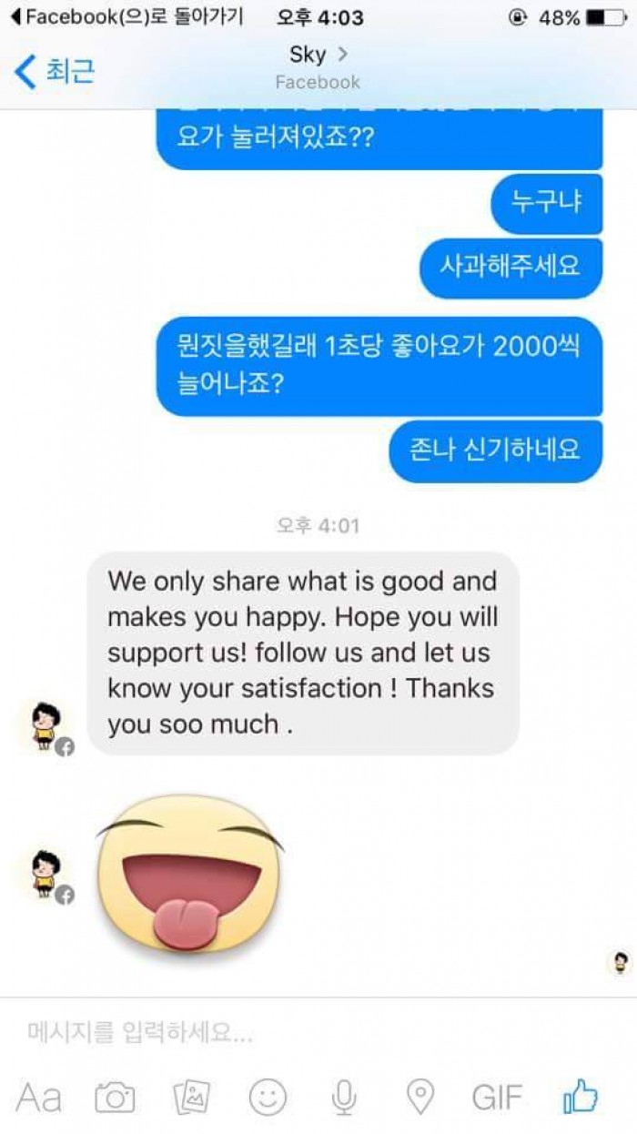 하지만 페이지 관리자는 "저희는 합법적인 페이스북의 기능을 사용한 새로운 페이지입니다. 안좋게 생각한다면 좋아요를 취소해도 좋습니다"고 답변했다.