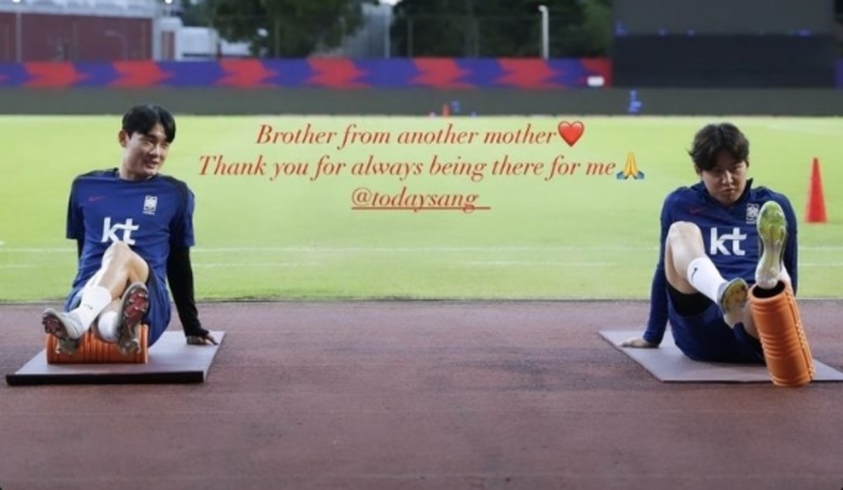 이강인은 14일 자신의 SNS에 "나의 또 다른 형제, 항상 곁에 있어 줘서 고마워"라는 글과 함께 대표팀에서 엄원상과 함께 훈련하고 어깨동무를 하며 대화를 나누는 사진을 업로드했다.