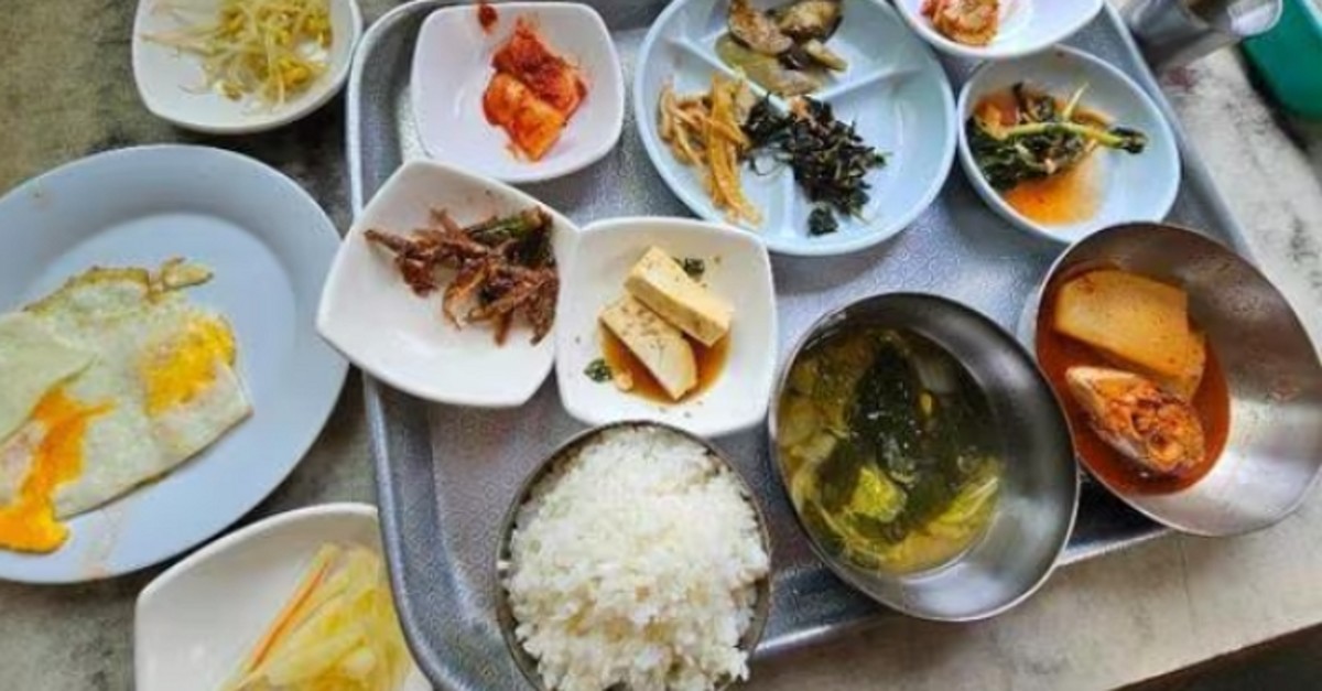 사진에는 배추김치, 열무김치, 달걀부침, 깻잎무침, 가지무침, 콩나물무침, 두부조림, 고등어무조림 등 13가지에 이르는 반찬과 함께 시래깃국, 고봉밥이 담겨 있었다.