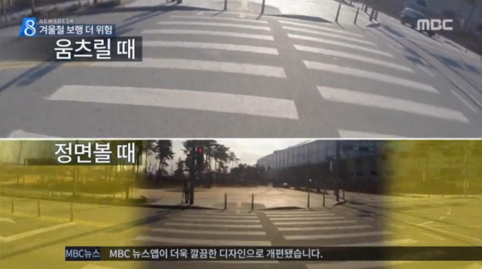 20일 MBC 뉴스데크스는 혹한의 추위가 찾아오는 겨울철에 보행자들이 잔뜩 움츠리는 탓에 시야가 크게 좁아져 안전사고가 발생한다고 보도했다.