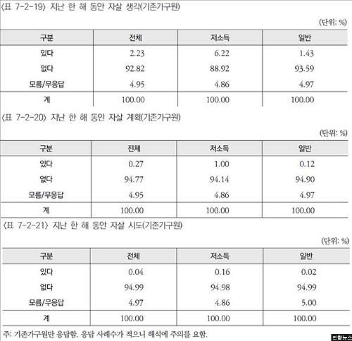 보고서를 보면 저소득층(중위소득 60% 이하)의 6.22%는 지난 한 해 동안 자살 생각을 한 적 있다고 답했다. 이 같은 응답률은 저소득층이 아닌 일반층의 1.43%과 큰 차이가 난다.