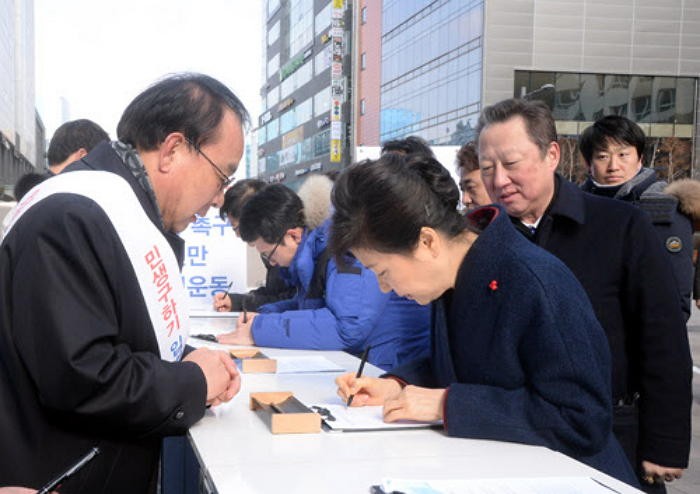 <박근혜 대통령이 18일 오후 경기도 성남시 판교역 광장에서 열린 민생구하기 입법 촉구 천만 서명운동 행사장을 찾아 서명하고 있다. ⓒ 연합뉴스>