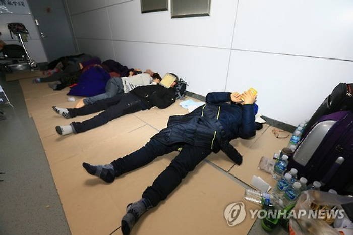 <지난 23일 오후 공항을 빠져나가지 못한 체류객들이 여객터미널에서 종이상자를 펴고 잠을 청하고 있다>