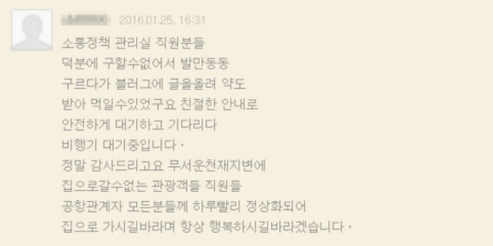 지난 24일 제주특별자치도 공식 블로그에는 자신을 '희귀병 앓고 있는 아이와 함께 제주도로 여행 온 엄마'라고 소개한 어느 한 체류객의 댓글이 올라왔다.
