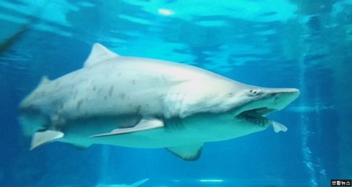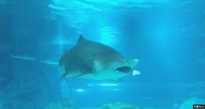 지난 28일 오후 6시 30분경 서울 코엑스 아쿠아리움에서 모래뱀상어가 1m 20cm크기의 까치상어를 통째로 집어삼켰다.