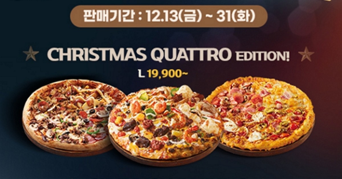 콰트로 피자는 한 판에 네 가지 맛을 즐길 수 있어 각종 모임에 잘 어울리며, 특히 프리미엄 피자부터 해피데일리 피자까지 크리스마스와 연말 모임에 모두의 입맛을 충족시킬 것으로 기대되는 메뉴로 1만원대, 2만원대, 3만원대 가격대로 출시됐다.