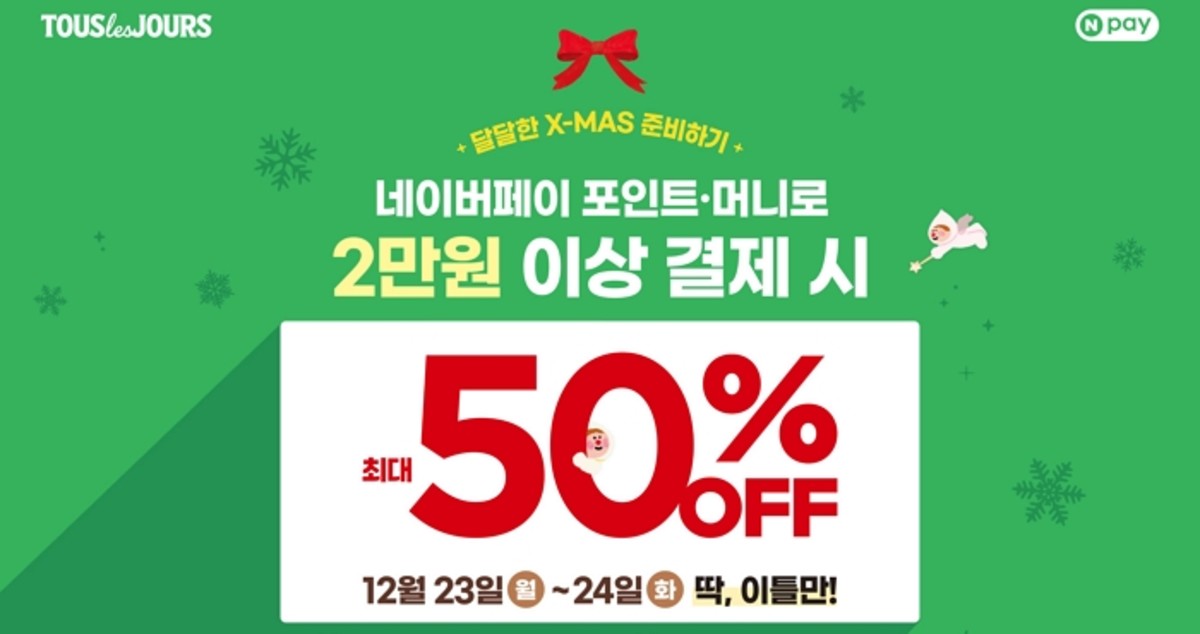 뚜레쥬르는 크리스마스를 앞두고 소비자들에게 풍성한 혜택을 제공하고자 네이버페이와 프로모션을 마련했다. 프로모션은 23일, 24일 단 이틀간 진행되며, 네이버페이 현장결제 가능한 뚜레쥬르 매장에서 1일 1회 참여할 수 있다.