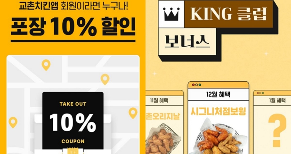 또한 오는 12월 31일까지 교촌치킨앱을 통해 포장 주문을 한 고객에게는 10% 할인 쿠폰이 제공된다. 특히 주문 횟수에 상관없이 매 포장 주문 시마다 무제한으로 할인 혜택을 받을 수 있으며, 해당 쿠폰은 전체 멤버십 회원에게 자동 지급된다.