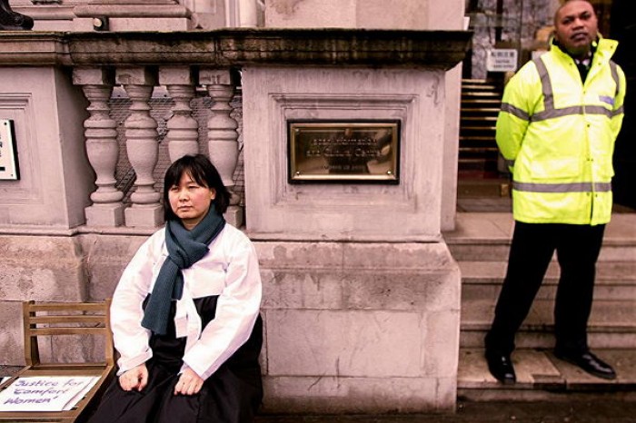 영국에 있는 일본 대사관 앞에 '살아있는' 위안부 소녀상이 등장해 영국인들의 눈길을 끌었다.