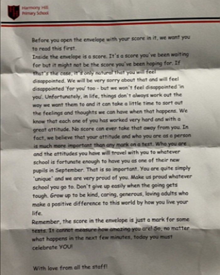 리스번에 있는 하모니 힐 초등학교의 교장 해리 그리어(Harry Greer)는 입학시험을 본 모든 학생들에게 축하와 격려의 편지를 보냈다.